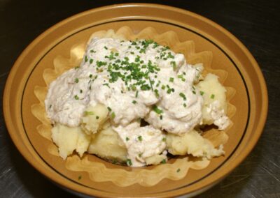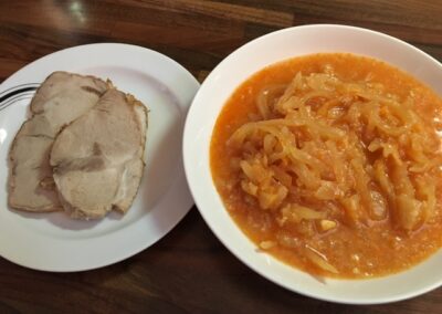 Zabeljeni ajdovi žganci z ocvirki, čebulo in smetano;